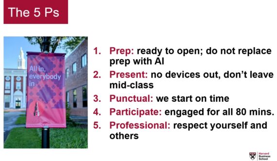 - If you’re going to be late, skip class; do not signal to our guests (extremely sought-after senior executives who manage $2 trillion of assets) that your time is more valuable than theirs.